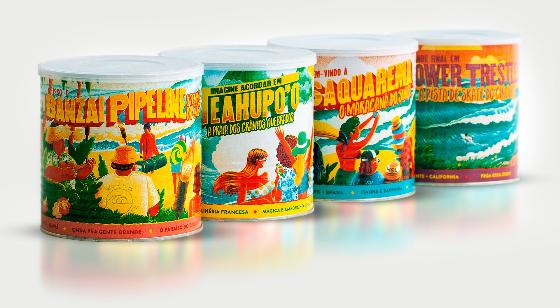 Neston's limited edition cans celebrating its partnership with WSL, and picturing the main events of world surf league.