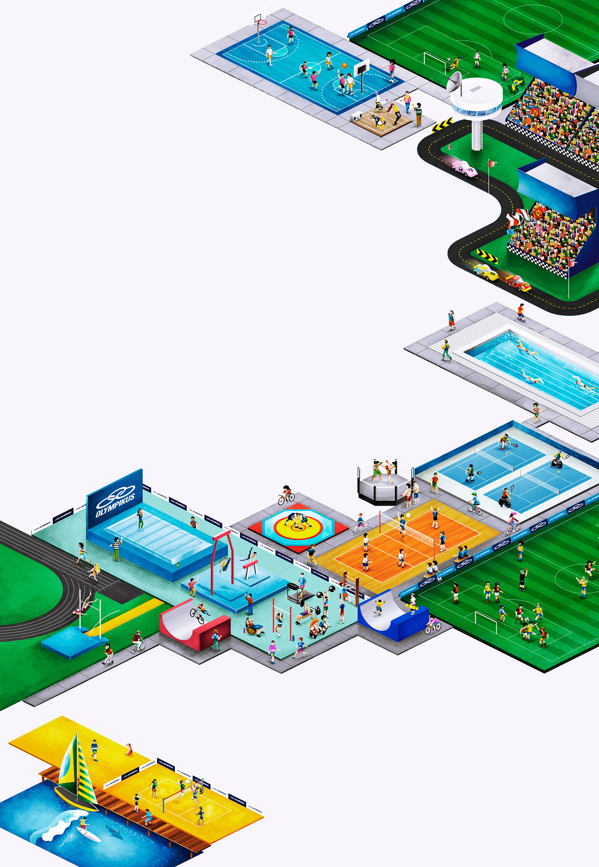 An isometric illustration created for an infographic showing the most practiced sports in Brazil, the illustration was used in an online campaign on the social networks of OLIMPIKUS and also on the campaign hot site.
