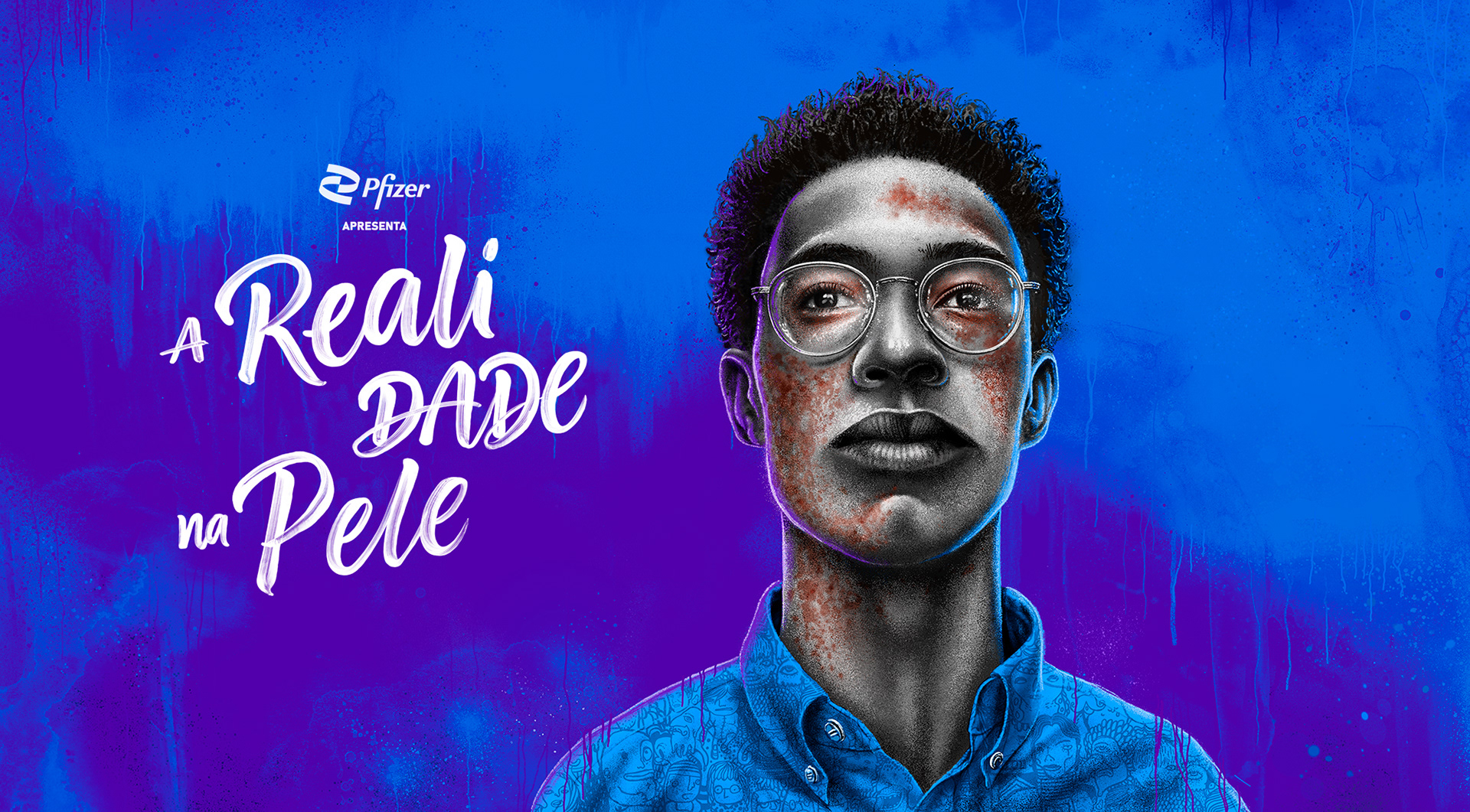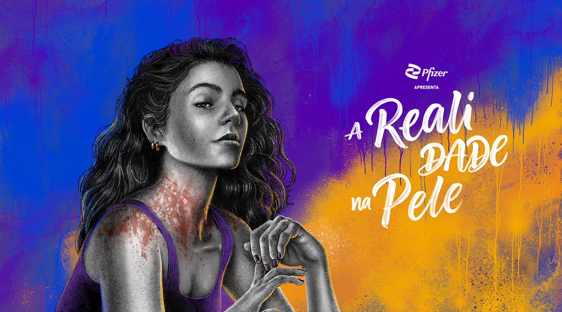 The challenge of this project was to talk about a skin disease (dermatitis), a non-communicable disease, in a way to empower patients. The illustrated characters should convey this idea of strength and pride. The illustration style has some street art characteristics, so we have a lot of digitally created paint texture, drips and spray. In order to highlight the dermatitis spots, we worked the characters in black and white. The typography was developed by artist Jackson Alves.