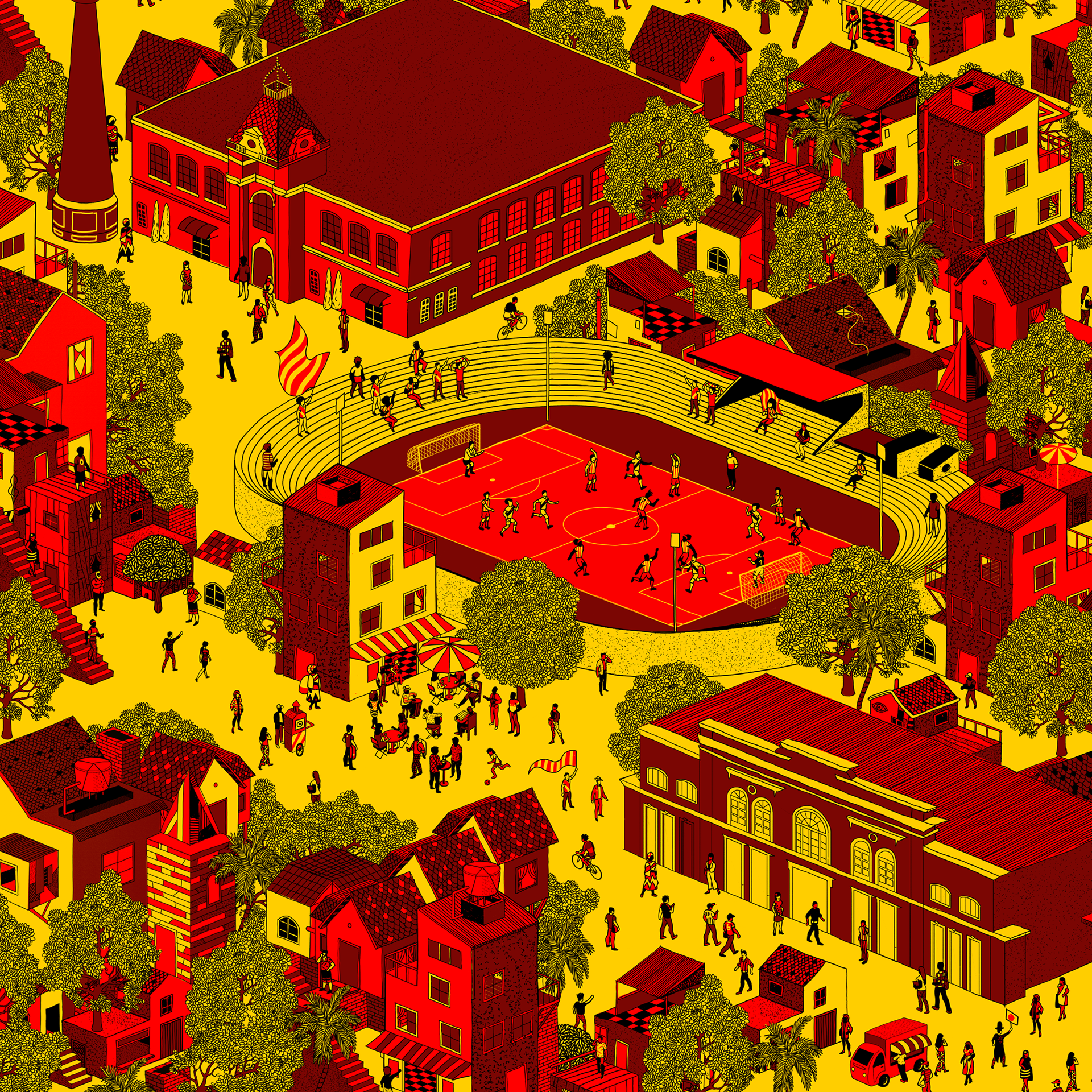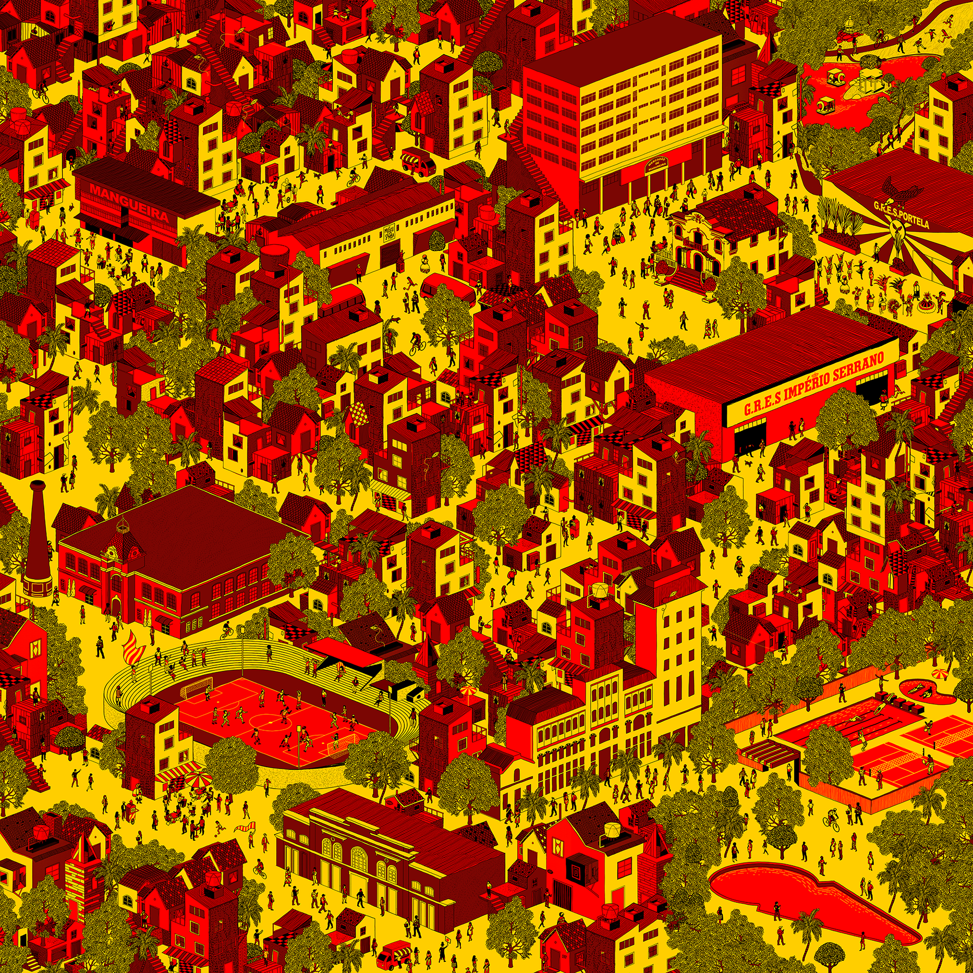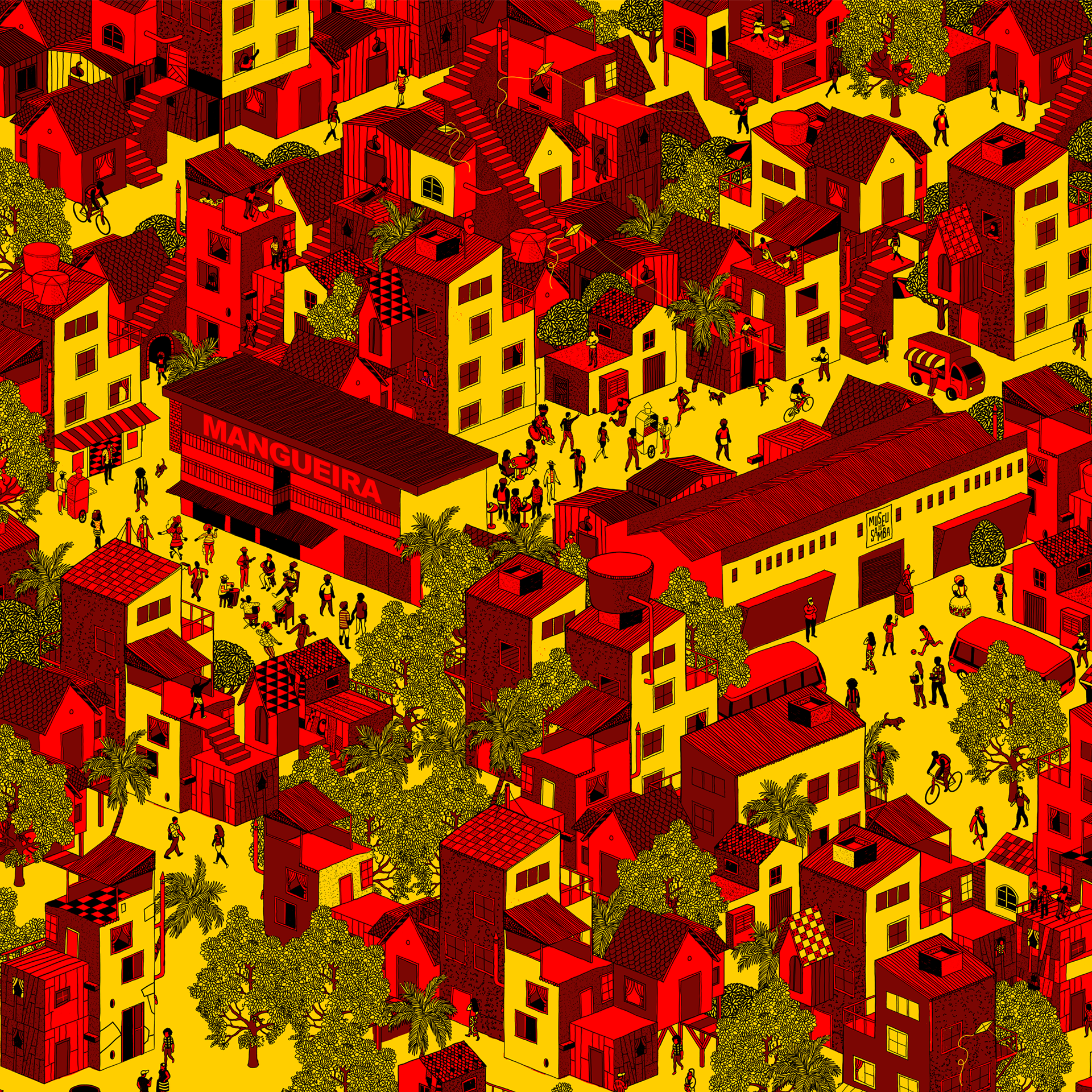 Isometric illustration showing the daily lives of people and attractions within 4 communities in Rio de Janeiro (Mangueira, Bangu, Madureira and Tijuca).
